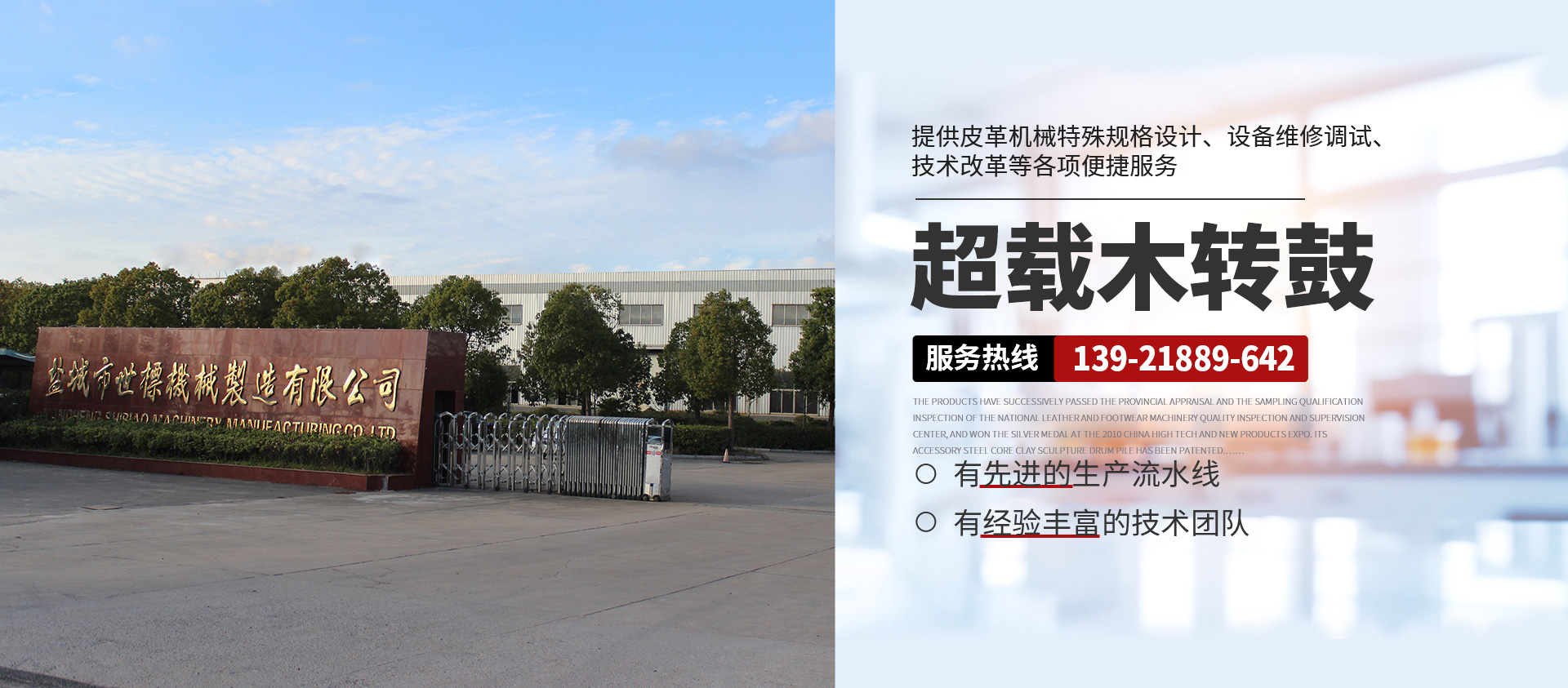 本公司常年提供超載木制轉(zhuǎn)鼓( 意大利/西班牙版本)、GJOB1-2型懸掛式木制轉(zhuǎn)鼓、鐵制轉(zhuǎn)鼓、Y型不銹鋼全自動分格鼓、全自動不銹鋼圓形、八角形摔軟轉(zhuǎn)鼓、PP染色等多功能轉(zhuǎn)鼓、HC系列劃槽、不銹鋼試驗轉(zhuǎn)鼓等皮革機械產(chǎn)品,產(chǎn)品暢銷浙江、山東、廣東、福建、河南、河北、四川、新疆、遼寧等地,且遠銷非洲、東南亞、南美洲、中美洲等多國,深受各大制革廠家的青睞。產(chǎn)品相繼通過省級鑒定和全國皮革、制鞋機械質(zhì)量檢測監(jiān)督中心的抽樣合格檢驗,在2010中國高新技術、新產(chǎn)品博覽會上一舉榮登銀獎寶座,其配件鋼芯泥塑鼓樁獲 專利權。本公司并向客戶提供皮革機械特殊規(guī)格設計、設備維修調(diào)試、技術改革等各項便捷服務,具有健全的檢測體系和可靠的售后服務。